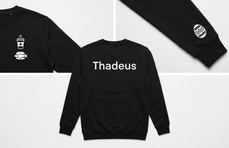 Schwarzer Pullover, Zimtlatte und Fischbrötchen auf der Brust, Ostereistickerei auf dem Ärmel, Text "Thadeus" auf dem Rücken. Wer ihn kennt, weiß Bescheid. Aus 100% Biobaumwolle.