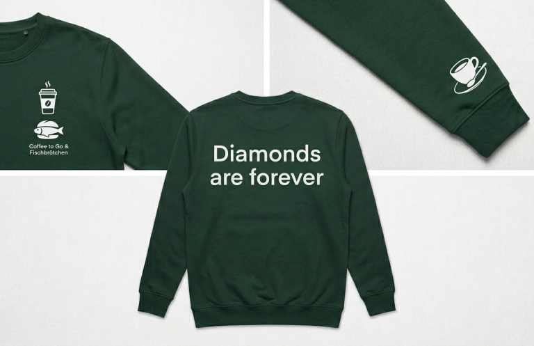 Dunkelgrüner Pullover, Zimtlatte und Fischbrötchen auf der Brust, Tasse auf dem Ärmel, Text auf dem Rücken. Für alle die wissen, was in Neustadt wirklich funkelt. Aus 100% Biobaumwolle.