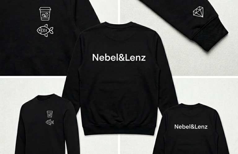 Schwarzer Pullover, Kaffee und Fisch auf der Brust, Diamant auf dem Ärmel, Text "Nebel & Lenz" auf dem Rücken. Das unschlagbares Ermittlerduo. Aus 100% Biobaumwolle.