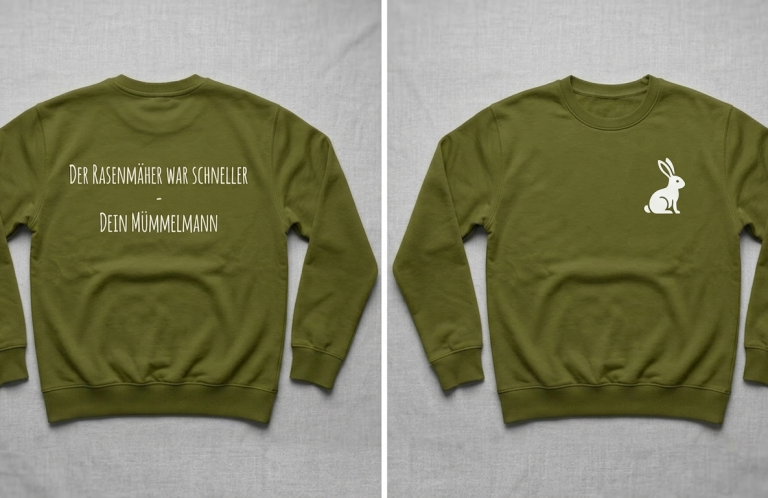 Olivgrüner Pullover, Kaninchen über dem Herzen, Text hinten. Für alle Freunde des Neustädter Osterfriedens. Wir werden Dich niemals vergessen. Aus 100% Biobaumwolle.